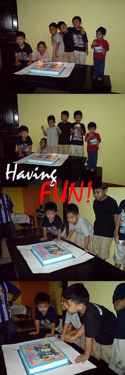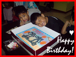 supposedly, Muhammad Akmal Muhammad Rafiee(black shirt): 21/01 but, my sister chose to combine both parties together which falls on 08/02(fyi, it's yesterday -.-) instead, that is somewhere in between both of the above stated dates, taking the public holidays to an advantage. wise choice, aye? :) presenting, the long-awaited cake; -.- as long as they're happy with it, lol. i learnt that they chose the design on the cake themselves by the way. and not only that, they received quite a load of presents too. kids these days are so lucky, i tell you. happy babies. ♥ my eyesight's worsening pretty badly. -irritated- just so you know, i really don't like the idea of having to work past midnight. personal issues, i guess. oh well. i miss you. and, goodnight. :) Labels: lyrics and party |